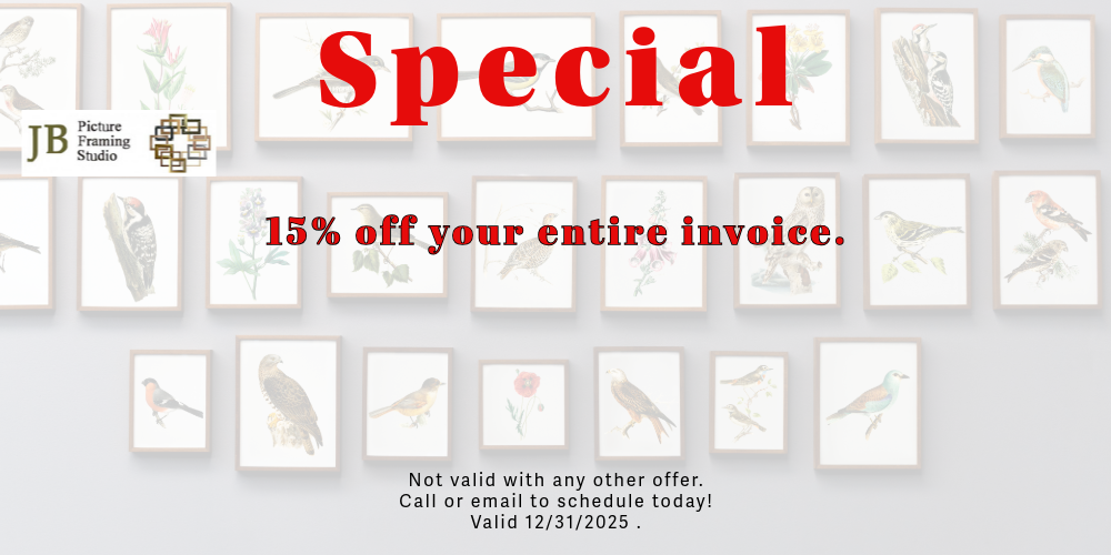 JB Picture Framing Studio Special Click the above image to open the image in a new tab, then print the image. Coupon must be printed and present at the time of order. Design Interviews Drop offs & Pick ups by Appointment Only Call Joe - 763-242-2244 Email Joe - jbframing@comcast.net Art Special Gift of Wonder by Michael Parkes $125.00 + Shipping View Special people have visited this site! Follow Us Follow